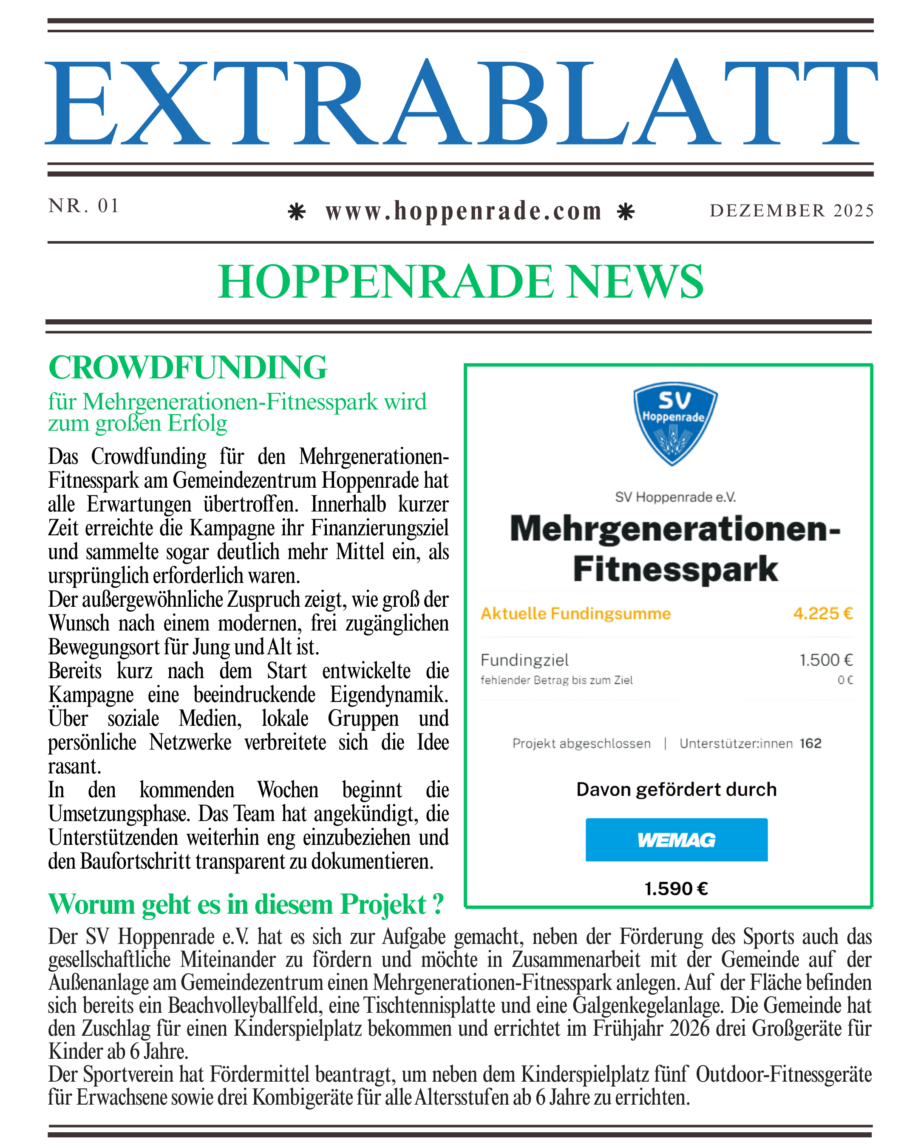 Die Aktion läuft noch bis zum 19.12.25 um 20:00 Uhr. Pro Person und pro 10,- € Spende erhalten wir von der WEMAG 10,- € dazu. Wer noch nicht gespendet hat und uns unterstützen möchte, findet den Link auf dem WhatsApp-Kanal der Gemeinde oder unter www.hoppenrade.com. Mit dem Geld sollen weitere Spielgeräte angeschafft werden, die wir gemeinsam mit Ihnen im Frühjahr aufbauen möchten.